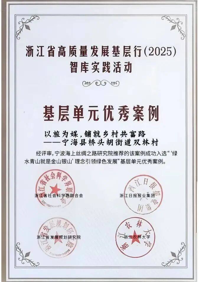 9月18日-19日,“‘绿水青山就是金山银山’理念引领绿色发展——浙江省高质量发展基层行(2025)”智库实践活动上,由宁波海上丝绸之路研究院报送,浙江万里学院农旅文融合科技特派员团队首席专家、城市与区域发展研究中心主任励效杰副教授主持的“以旅为媒,铺就乡村共富路——宁海县桥头胡街道双林村”案例荣获基层单元优秀案例。