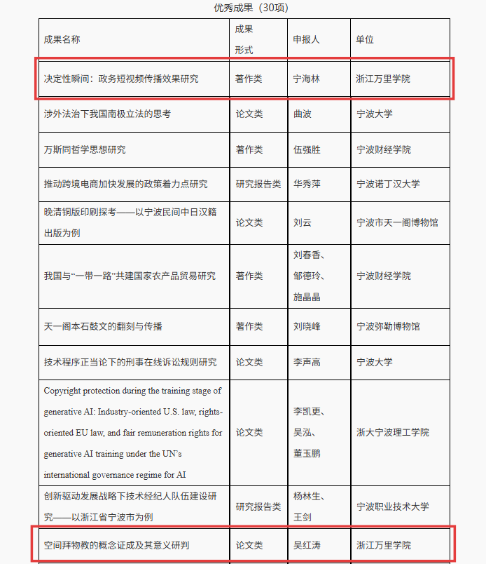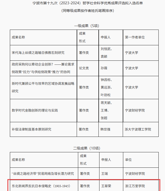 9月25日,宁波市哲学社会科学工作办公室公布了宁波市第十九次哲学社会科学优秀成果评选结果的通知。我校商学院王扬眉教授及其团队共同完成的论文成果获三级成果奖;信息与智能工程学院王翠荣老师《东北新闻界反抗日本侵略史》获二级成果奖,宁海林、吴红涛老师获优秀成果奖。