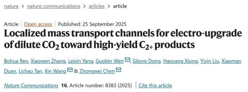 9月,国际综合性顶级期刊Nature Communications(2024 年影响因子15.7)近期迎来重要研究成果——浙江万里学院碳中和研究院以第一单位合作发表重磅论文“Localized mass transport channels for electro-upgrade of dilute CO₂ toward high yield C2+ products”(局部传质通道助力稀释CO₂电催化升级,实现高产率C2+产物),陈忠伟、王新、文国斌为该论文通讯作者。该论文的发表标志着学校在碳中和领域关键技术研究上取得突破性进展,顶刊成果再添新彩。该研究成果的发表为工业规模的C2+产物合成提供了全新的思路和方法,有望推动电化学CO2还原技术从实验室走向实际工业应用的进程,对助力全球碳中和目标实现、推动绿色低碳产业发展具有重要意义
