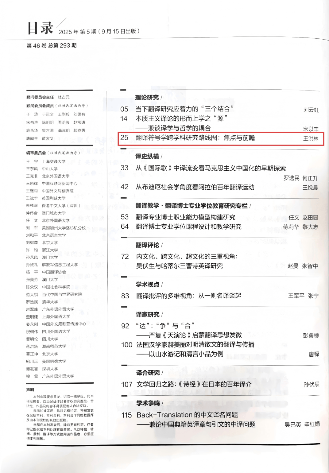 10月17日,我校外语学院王洪林教授在《中国翻译》2025年第5期发表研究论文《翻译符号学跨学科研究路线图:焦点与前瞻》,该文聚焦翻译符号学研究前沿话题,是国家社科基金一般项目“中国影视外译符际意义再生与变异机制研究”(23BYY125)的阶段性研究成果。