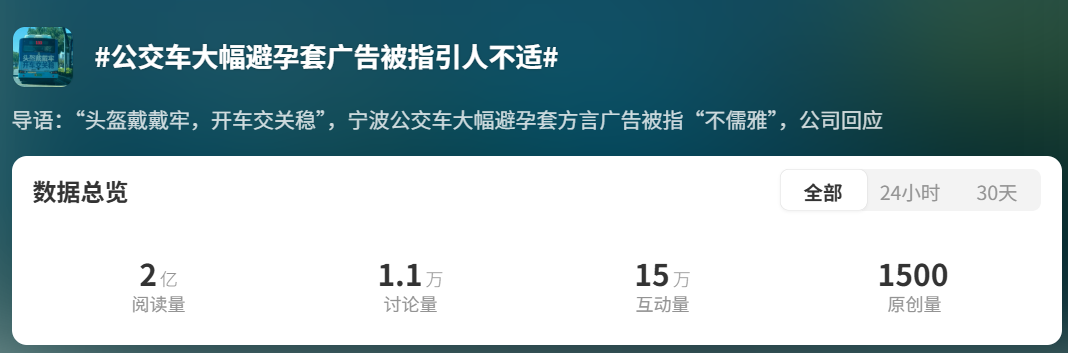 截至9月12日下午记者发稿,社交媒体平台话题“公交车大幅避孕套广告被指引人不适”阅读量突破2亿。网友们围绕城市公共空间管理、商业广告边界、地域文化认同和性观念开放程度等多个维度展开讨论。