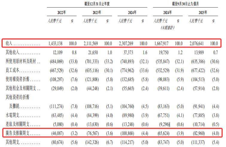 此外,巴奴在品牌推广和营销上也下了不少功夫。招股书显示,2022年至2024年,巴奴的广告及推广开支分别为4608.7万元、7656.7万元和1.01亿元。2025年9月末,该数据为8296万元,总体合计为3.06亿元。