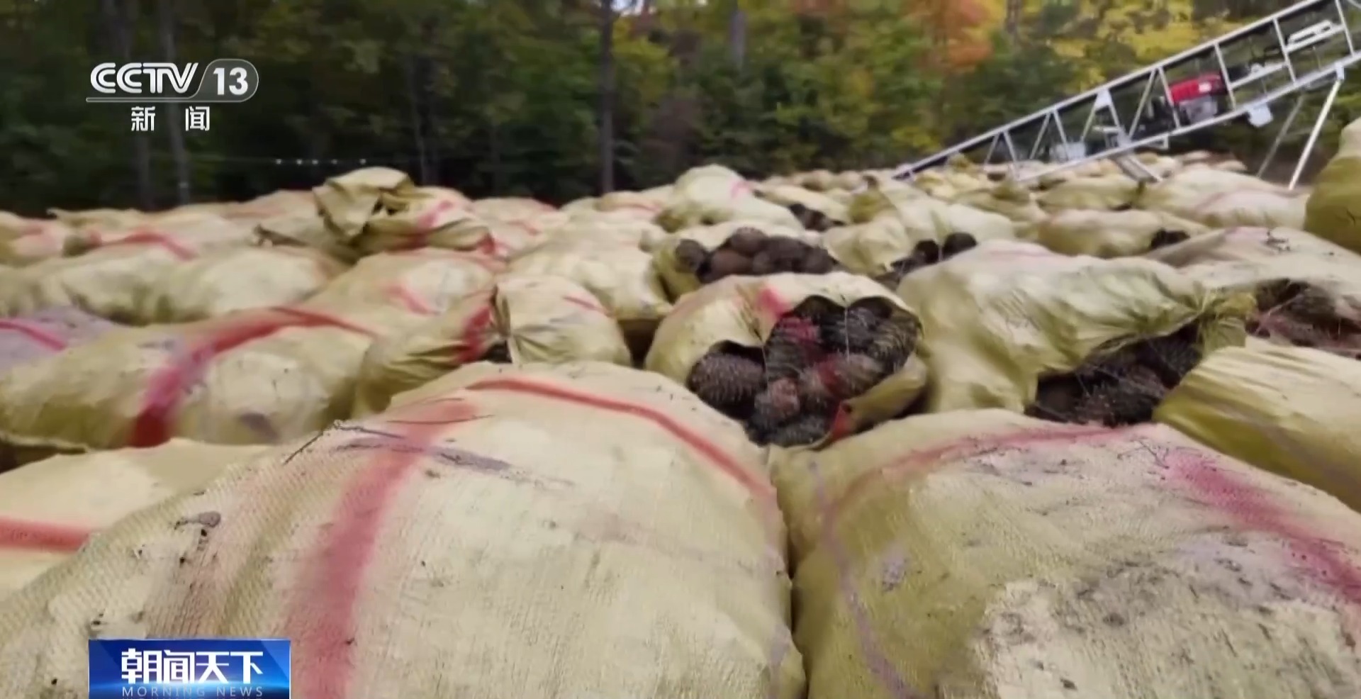 打下的松塔装袋后,统一运往山下收购点称重。每袋约300颗松塔,收入约180元。像孙广福这样的熟手,一个采收季能挣四五万元。