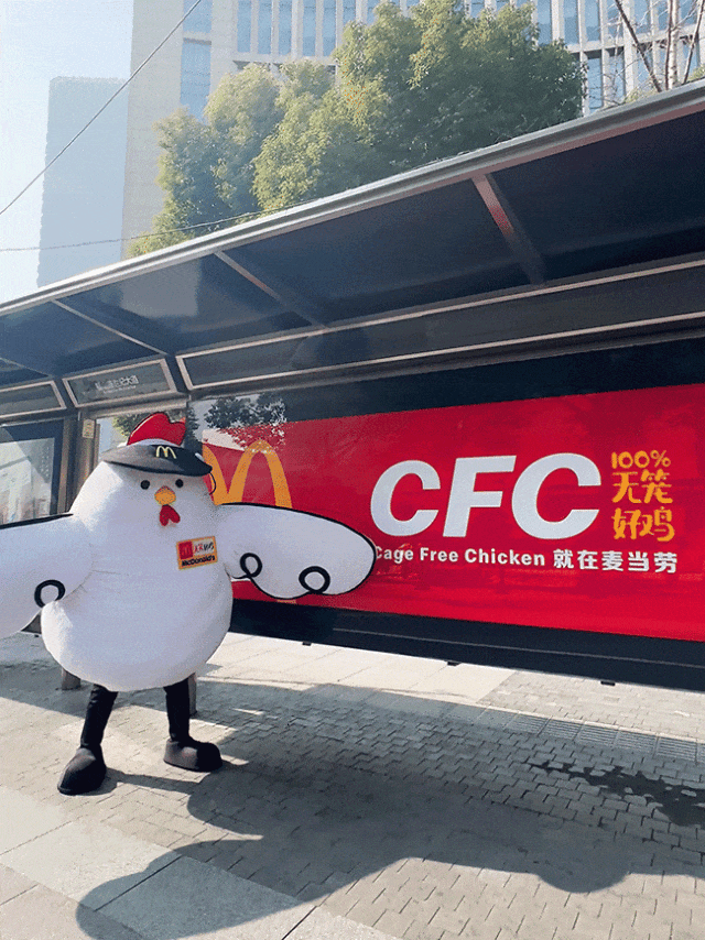 沿用红底白字、斜体字样的设计,将“CFC”(Cage Free Chicken)放在画面的视觉中心,让路过的观众一眼就能get到其意有所指;部分海报还直接标注“100%无笼好鸡,就在麦当劳”,疑似暗指肯德基的“变异鸡”传闻。