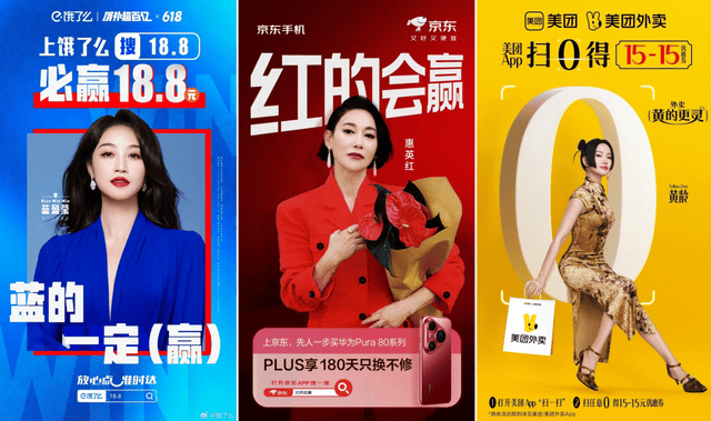 就像之前外卖大战时期,“蓝方代表”饿了么签约蓝盈莹、“红方代表”京东签约惠英红、“黄方代表”美团签约黄龄,品牌善于利用谐音,将大众对艺人姓名的认知,“嫁接”并且转化为对自身的品牌认知。