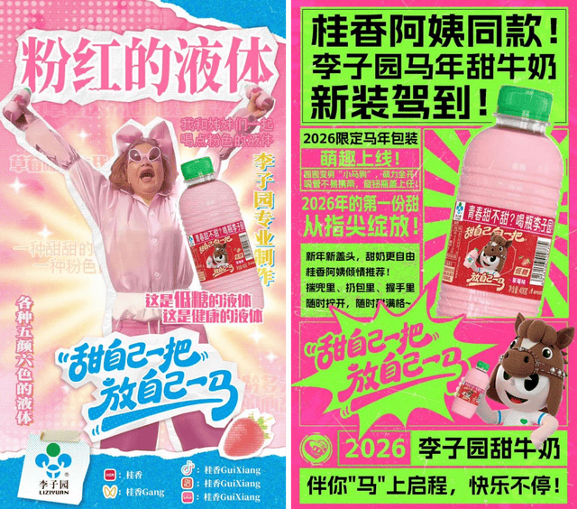 几乎同期,老牌牛奶食品品牌李子园,尝试挣脱“登味饮品”的刻板标签,用一场“粉色液体风暴”席卷全网。