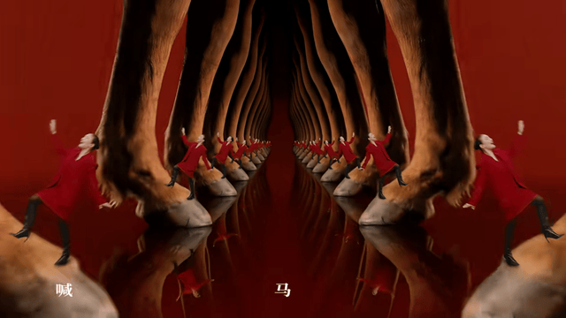 短片里,马思纯梳着双马尾,发尾“长”出两匹小马,加上热烈抓眼的红色背景、眩晕的视觉感,怪诞的画面中透着一丝诡谲,搭配魔性洗脑的歌词,把 “马黏马思纯”的谐音梗,玩出了具象又上头的创意感。